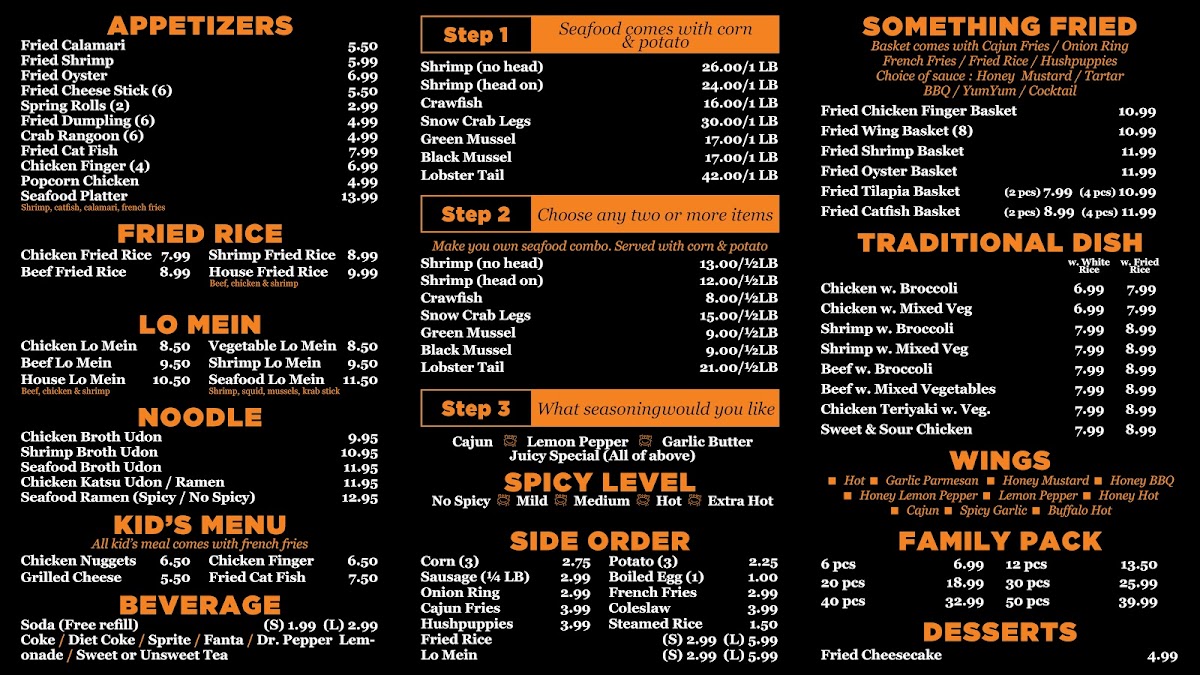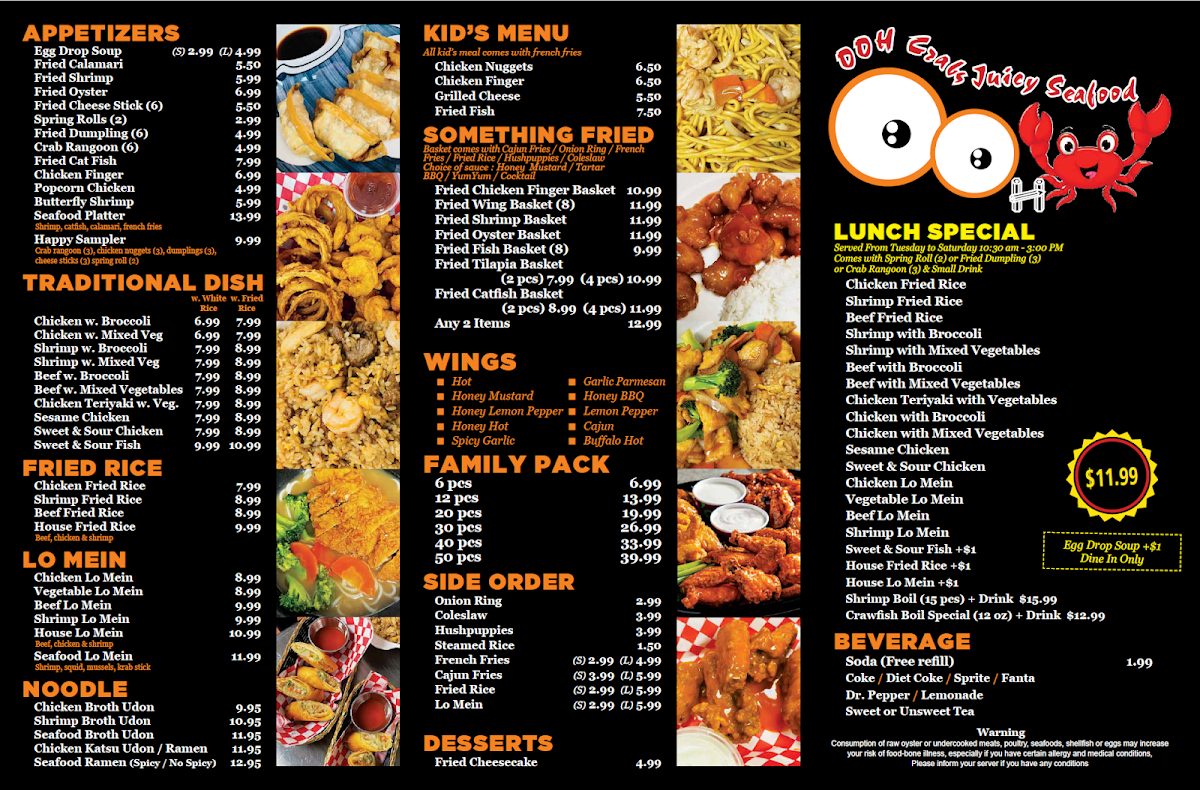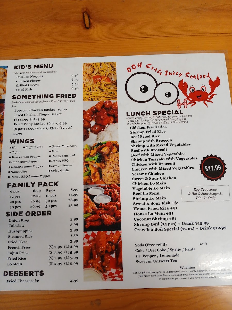 Welcome to Ooh Crabs Juicy Seafood Inc, where seafood lovers gather for a delightful culinary experience in the heart of Dadeville, AL. Located conveniently at 17957 US-280 SUITE D, this vibrant eatery offers a menu brimming with succulent seafood options, from their signature seafood combos to delicious Lo Mein dishes. Indulge in the Ooh Crab! combo, featuring a satisfying ensemble of eggs, corns, and potatoes, or explore the various Lo Mein options, rich with flavor and satisfying portion sizes. Customers rave about the quick service and generous leftovers, with standouts like the Seafood Lo Mein leaving a lasting impression. Desserts such as fried cheesecake add a sweet finish to your meal. With positive reviews highlighting the delicious food and welcoming atmosphere, Ooh Crabs Juicy Seafood Inc truly promises a seafood feast that’s hard to resist!